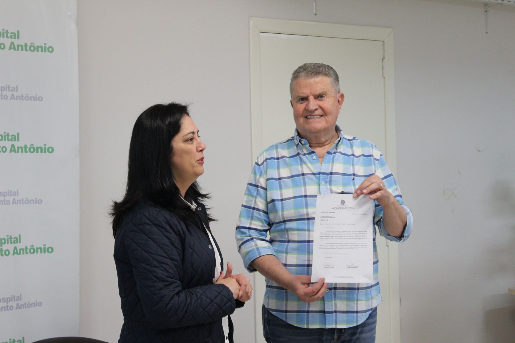 No dia 08 de abril, o Hospital Santo Antônio recebeu a Chefe de Gabinete Cris Lohmann, representante do Deputado Federal Márcio Biolchi (MDB), para a entrega de uma emenda parlamentar no valor de R$ 200 mil, destinada ao custeio da instituição.